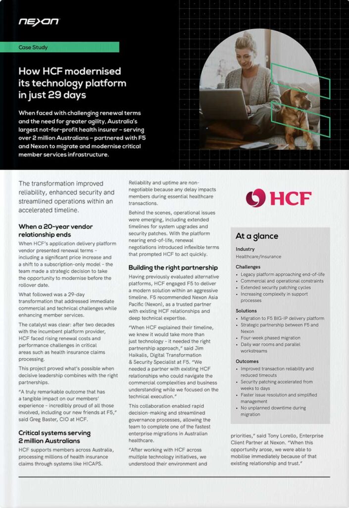 Facing challenging renewal terms and the need for greater agility, Australia’s largest not‑for‑profit health insurer partnered with F5 and Nexon to migrate and modernise critical member services infrastructure in just 29 days. Serving over two million Australians, HCF needed to address rising costs, performance challenges in health insurance claims processing, and operational bottlenecks such as extended upgrade and security patching timelines, while keeping reliability and uptime non‑negotiable.